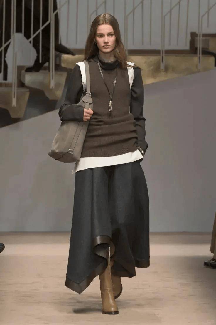 本季秀场频繁出现“针织+丝质”“宽松+立体剪裁”的组合,强调舒适与结构感的共生,日常穿也毫不违和。