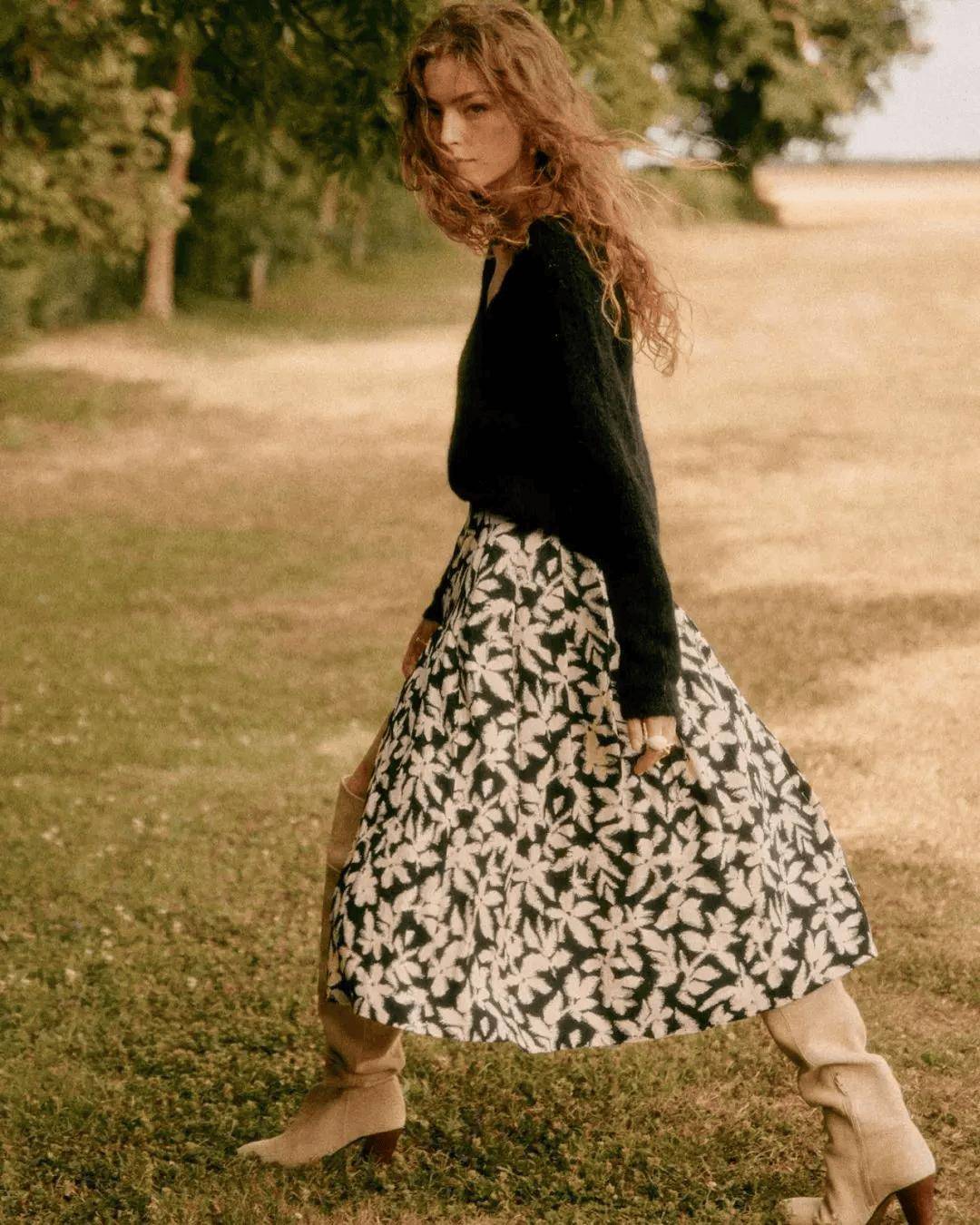 想让基础款毛衣穿出彩?一条有图案的裙子就能打破沉闷!本季印花趋势更偏向 “抽象笔触花朵”与 “复古几何纹样”,搭配时记住 “繁简平衡”。