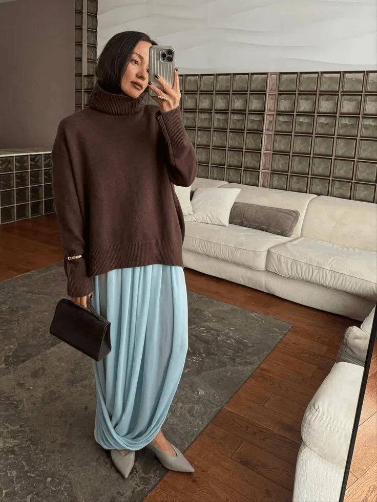 柔软材质的长裙能中和毛衣的膨胀感,走动时裙摆如涟漪摇曳,尤其适合搭配今年流行的 “低饱和度色系”(燕麦色、灰粉、雾霾蓝)。