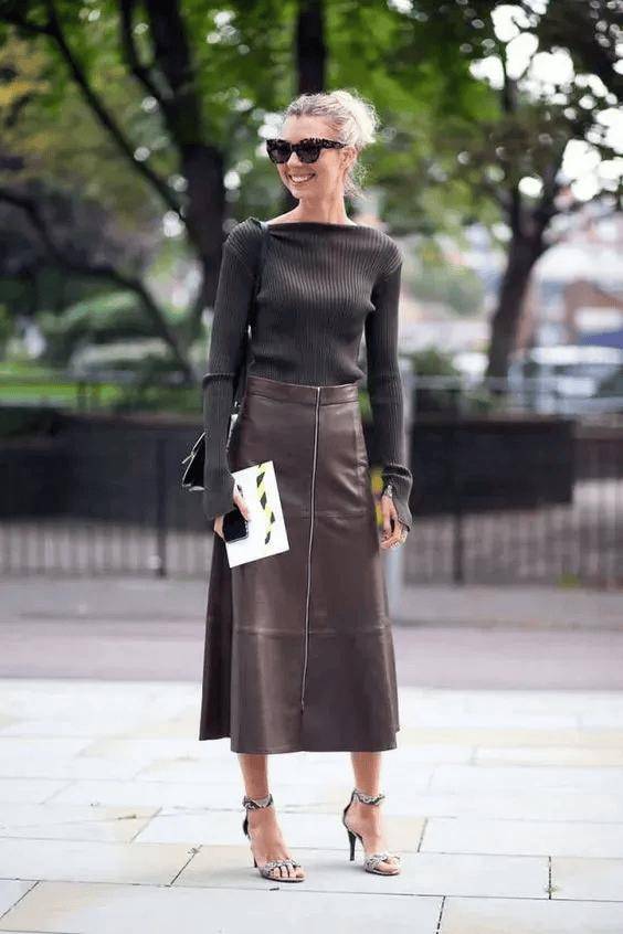 如果皮裙是高腰款式,效果会更好。或者搭配一条腰带,不仅能强调腰线,还能为整体造型增添亮点。