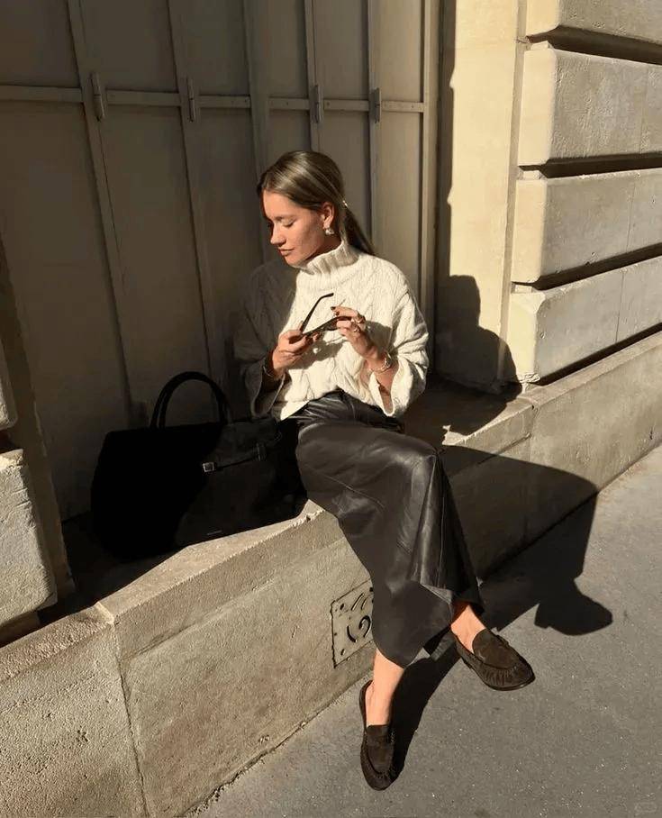 对梨形身材或想显瘦的女生来说,这个组合更是 “刚需款”:柔软的毛衣能弱化上半身线条,开衩皮裙则能巧妙露出脚踝或小腿最细的部分,视觉上拉长比例,走路时开衩随步伐轻晃,既保持了舒适放松的穿着感,又藏着不刻意的时尚态度,日常通勤或约会穿都很合适。