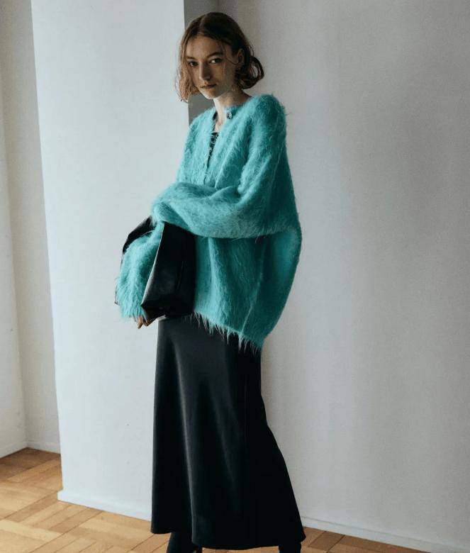 它的柔美质感能巧妙中和毛衣的膨胀感,让整体造型更加轻盈。