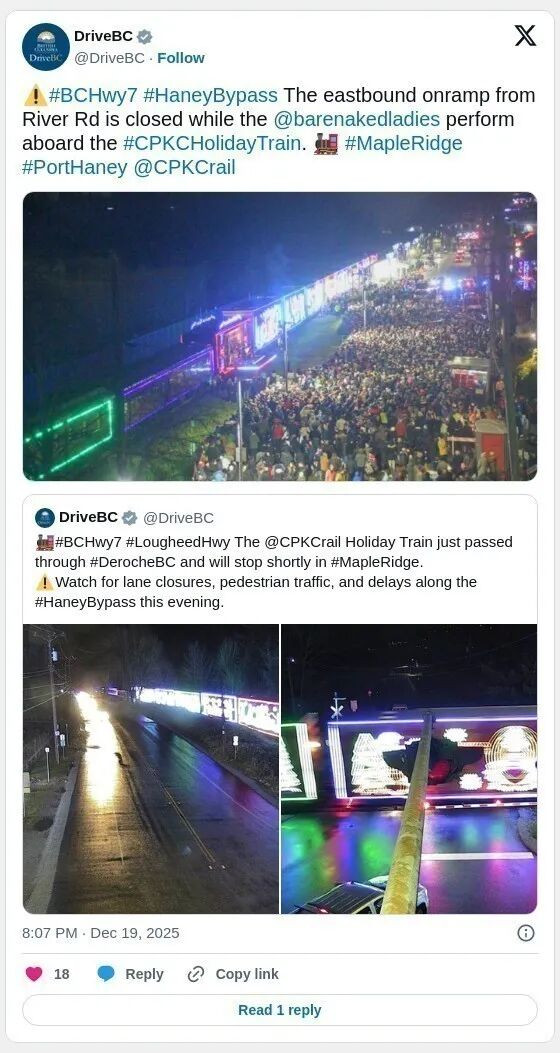今天下午,CPKC假日列车将抵达大温两个车站:分别是穆迪港 (Port Moody )和高贵林港(Port Coquitlam ),表演嘉宾: Barenaked Ladies