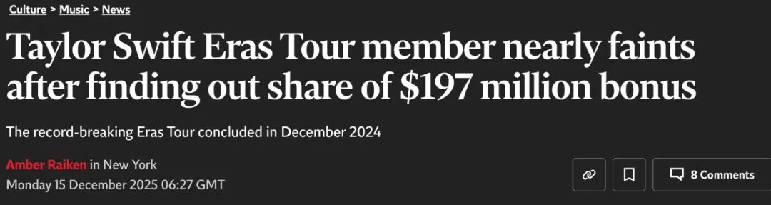 在Eras Tour巡演结束后,她给舞者、乐手、司机、灯光师等幕后团队分发了近2亿美元的奖金——不是噱头,是实打实的钞票。