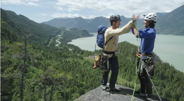 在《探索新境》第二季里,他沿着近乎垂直的岩壁一路攀到顶,眼前是蓝到发光的豪湾(Howe Sound),身后是雪峰、森林与巨岩。