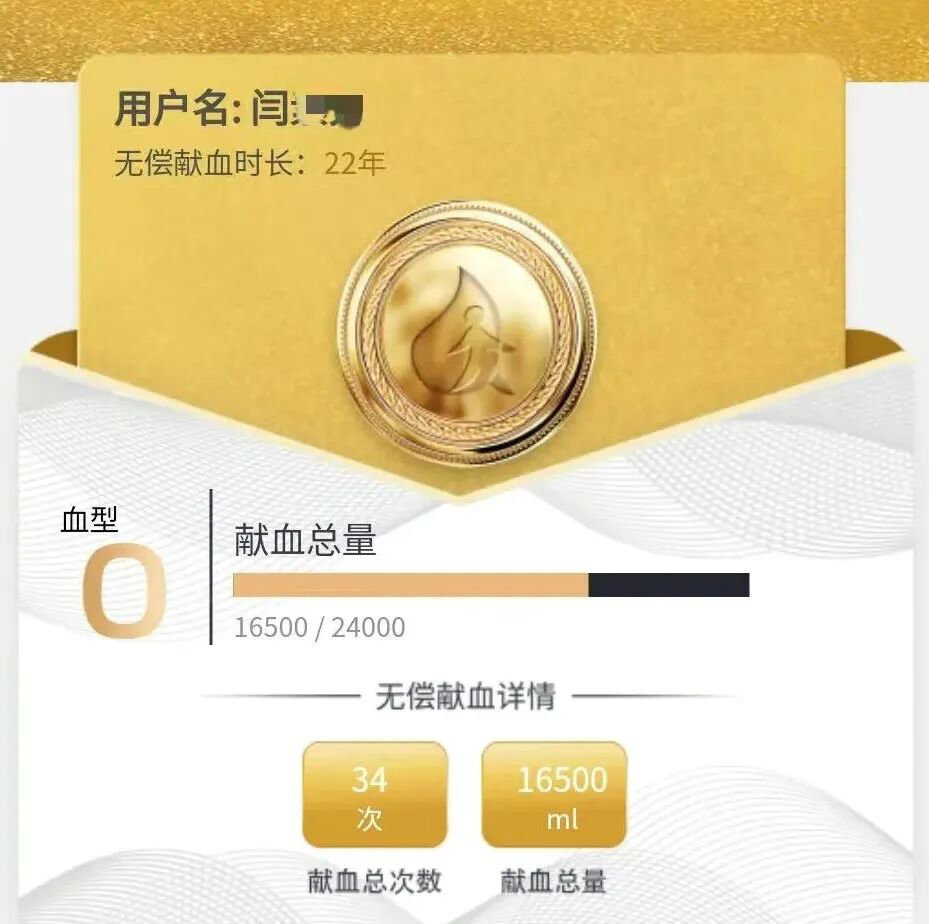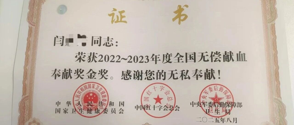 正因如此,2025年8月,她获得了“2022-2023年度无偿献血奉献奖金奖”(由国家卫健委、中国红十字会总会、中央军委后勤保障部卫生局联合颁发)。