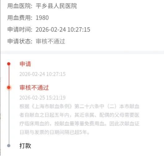 唯一把婆婆划入范围的是上海,把“献血者配偶的父母”明确列入免费用血之列。不过,2月24日,当闫大姐向上海市血液中心申请报销时,也在次日被拒绝了。上海拒绝的理由是“献血证日期与发票的日期间隔已超5年”: