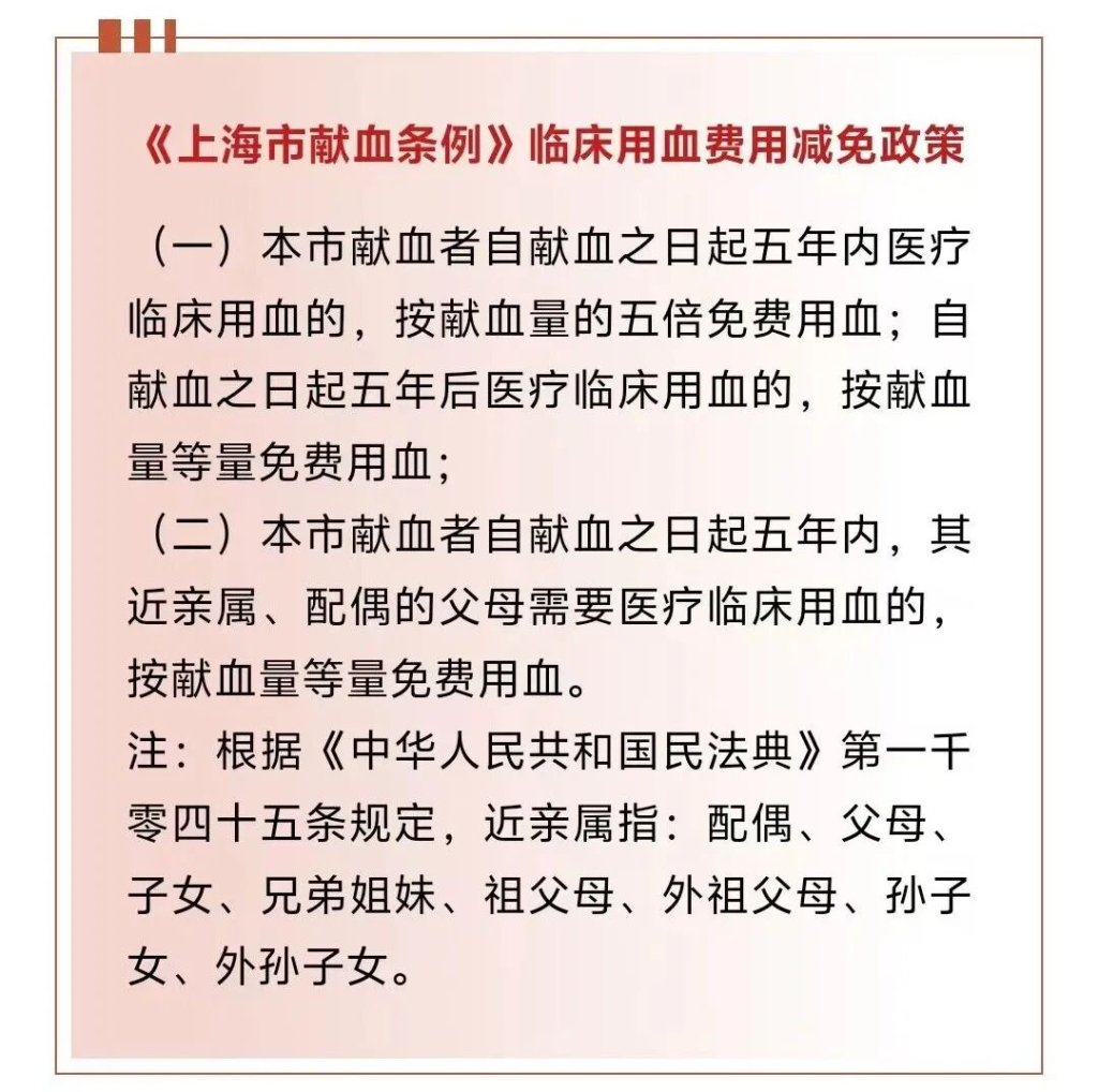 我逐个城市查了一遍,《北京市献血条例》(2021年)、《深圳经济特区无偿献血条例》(2015年)、《广东省卫生健康委关于进一步保障全省无偿献血者优先用血的通知》(2025年施行)、《武汉市献血条例》(2023年)的基本规定都是:“献血者本人终身免费用血,配偶、直系亲属按献血量等量免费。”