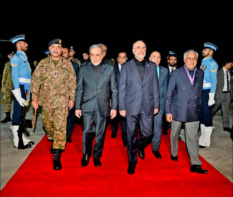 伊朗国会议长卡利巴夫(右二)、外交部长阿拉奇(左二)11日抵达巴基斯坦与美国进行谈判。(欧新社)
